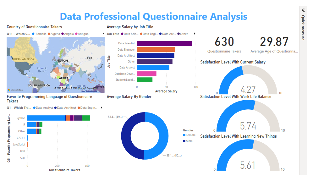 This project delves into the demographics and job satisfaction of data professionals, presenting insights through a user-friendly dashboard built with Power BI. The dataset was provided from questionnaire about job satisfactory by Alex The Analyst. We can see that most data professionals are somewhat decently satisfied with their current salary, work life balance and the opportunity to learn new things in their current position. Most of the questionnaire takers are from United States and United Kingdom, most preferred programming language is Python, highest average salary by job title is on Data Scientist Category, and average salary by gender is roughly the same for each gender with females having slight upper-hand.
